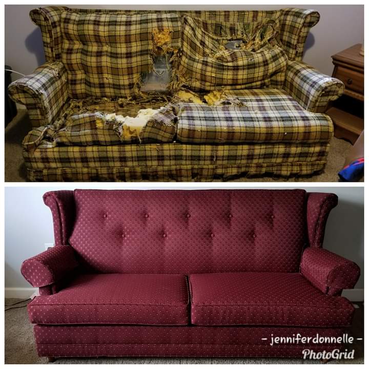 The photo on the bottom is THE SAME DAMN SOFA BED that just returned from getting a much-needed makeover. 😁😁😁